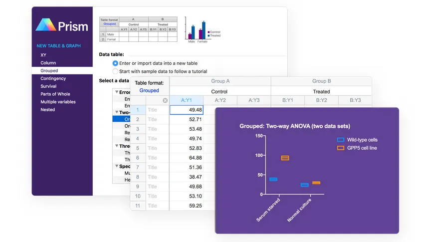 Prism 专为您要运行的分析而设计,包括定量和分类数据的分析。这使得正确输入数据、选择合适的分析和创建令人惊叹的图表变得更加容易。