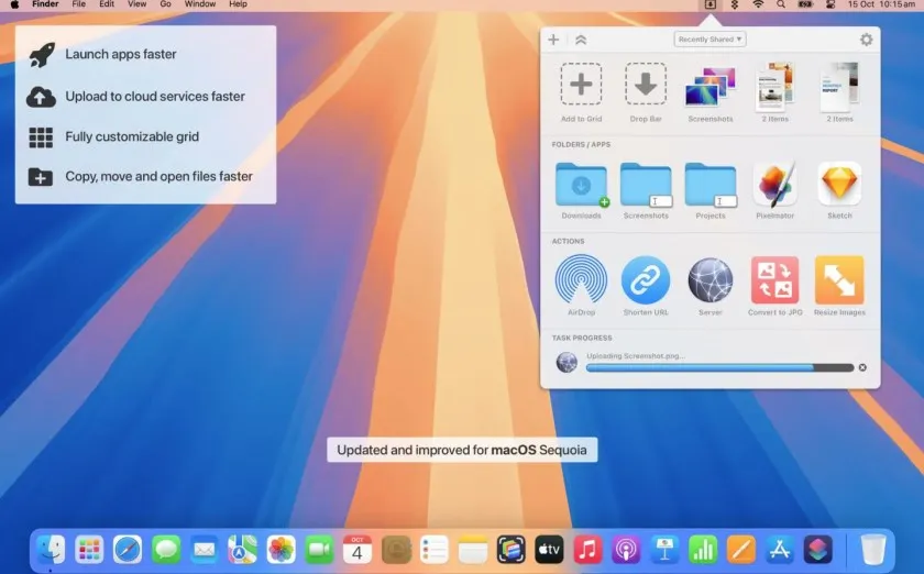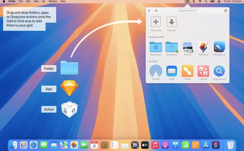 Dropzone 还包括Drop Bar-Drop Bar使您可以轻松隐藏以后知道需要的文件。只需将文件拖放到网格中的“拖放栏”图标上,它们就会一直粘贴在那里,直到您准备好使用它们为止。根据需要设置可自定义的动作网格,并根据需求的变化交换不同的动作。