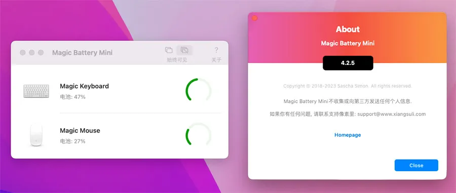 - 多设备支持:无论是 Magic Mouse、Magic Keyboard 还是其他蓝牙外设,应用都能精准检测电池状态。