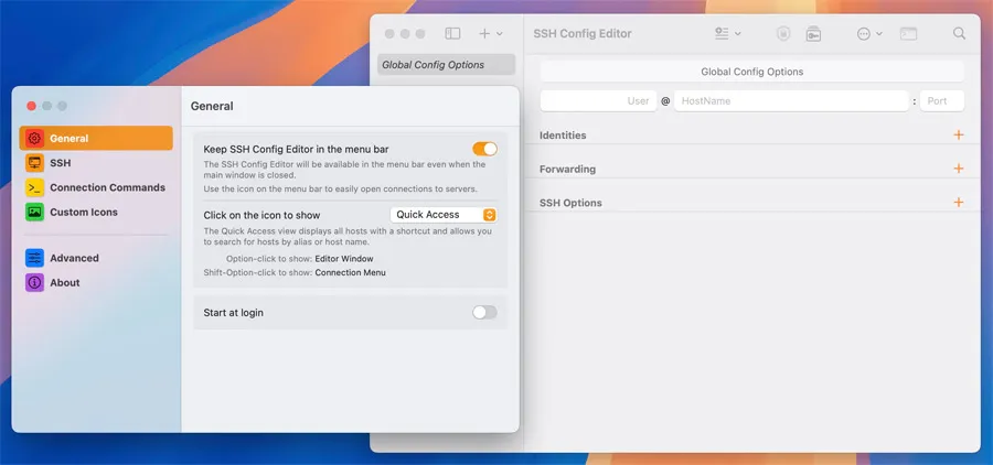 在Mac上使用 SSH Config Editor Pro,操作界面简洁明了,符合macOS的交互逻辑。用户无需记忆复杂的SSH语法,只需通过图形化面板选择目标主机、设置参数,即可自动生成标准化配置代码。对于习惯使用终端的用户,软件也支持双向同步,可直接编辑原始 .ssh/config 文件,并实时反映到图形界面中。支持Touch Bar操作与系统菜单栏快捷方式,为Mac用户提供更加本地化、便捷的使用体验。