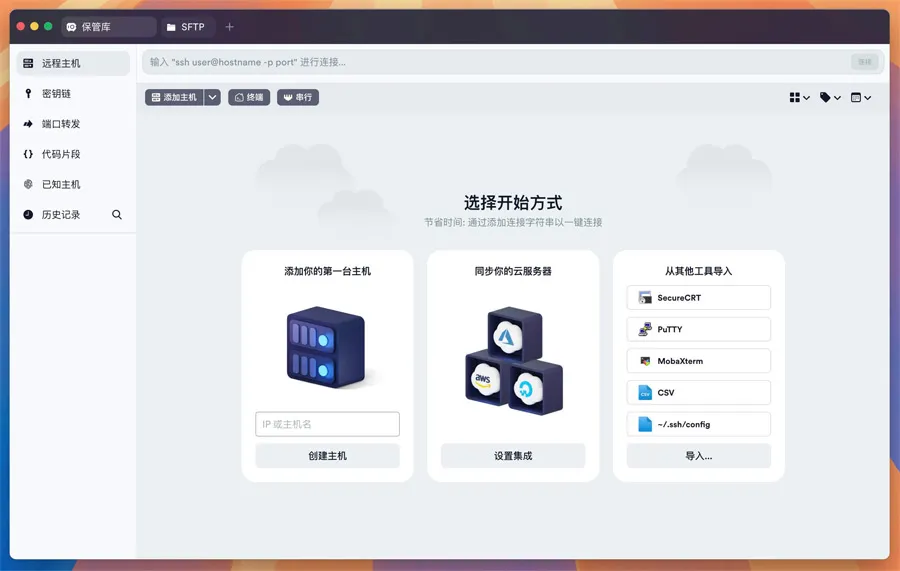 支持通过云账户在 Mac、iOS、Windows、Linux 等多个平台间同步主机数据与配置。