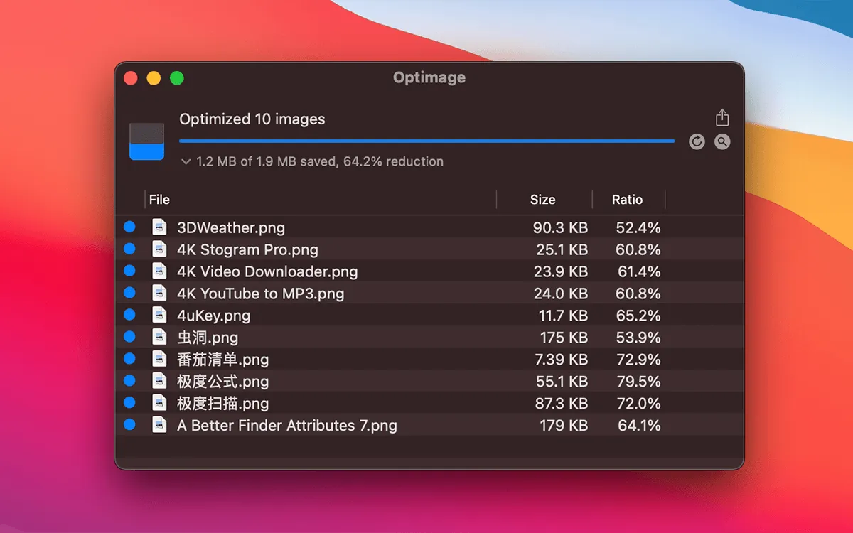 优化后生成报告,显示每张图片的大小变化和压缩率,方便用户分析效果。 -