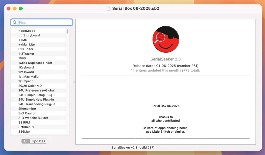 Serial Box 是一款专为 Mac 用户设计的软件序列号管理工具,能够帮助用户轻松管理和查找已购买软件的序列号、激活码及其他许可证信息。对于需要处理大量软件和工具的用户来说,Serial Box 提供了一个高效、安全的方式来储存、组织和检索所有序列号和激活信息。无论是购买的商业软件、开发工具,还是其他专业应用,Serial Box 都能帮助用户集中管理这些重要数据,避免遗失或忘记激活信息。