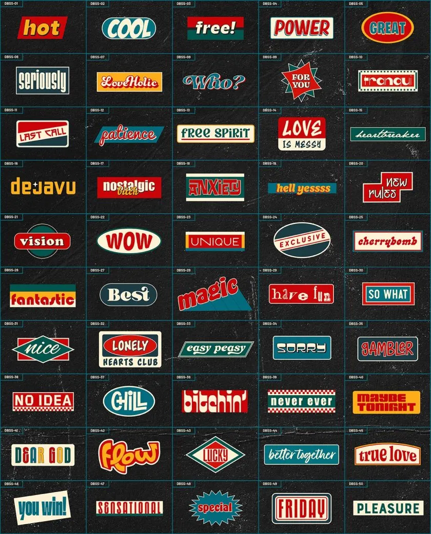 50 个不同的单词和号召性用语已准备好以 PNG 格式使用。Dirtybarn 很高兴介绍我们的 Word Clippings:由graziaesthetica提供和创建的复古贴纸和标题。