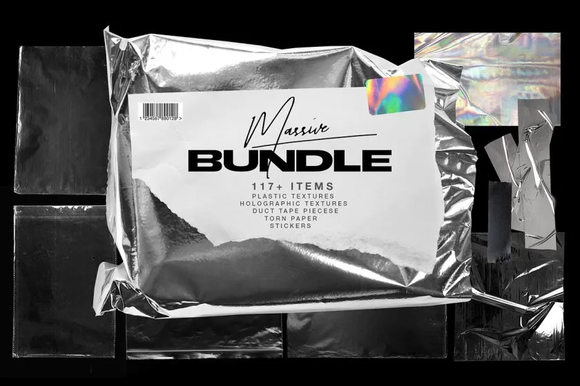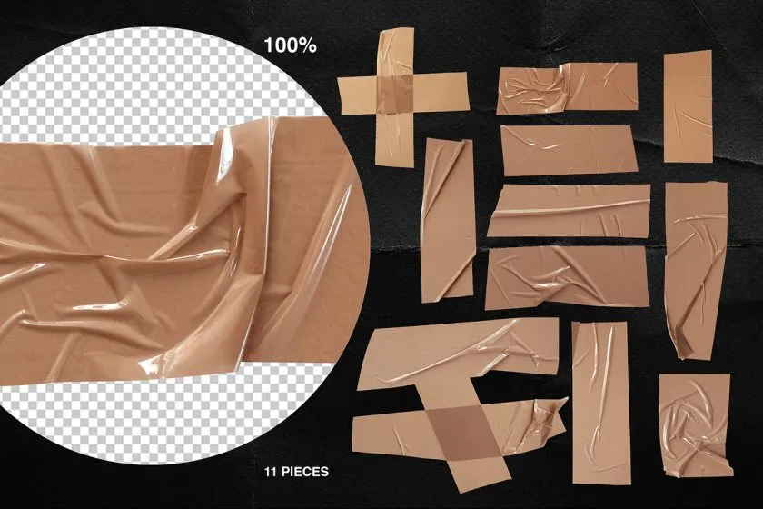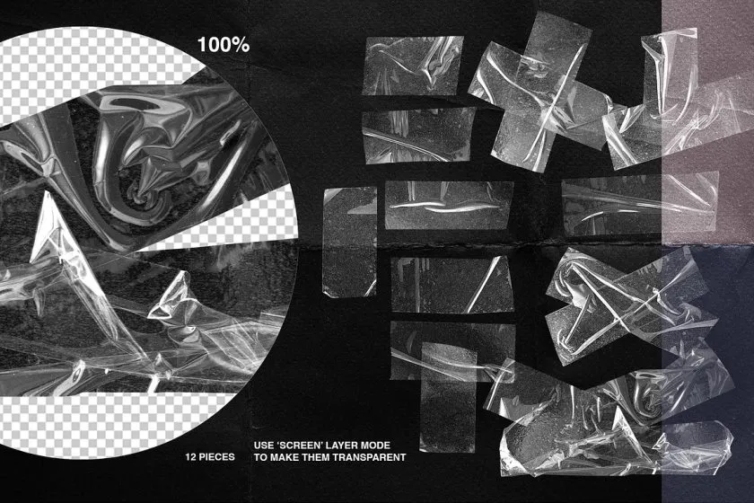 大量塑料包装、撕纸和胶带束!令人敬畏的最时尚物品系列:保鲜膜纹理、胶带片、撕碎的纸片、贴纸、全息纹理和徽标。这就是您的品牌脱颖而出所需要的!