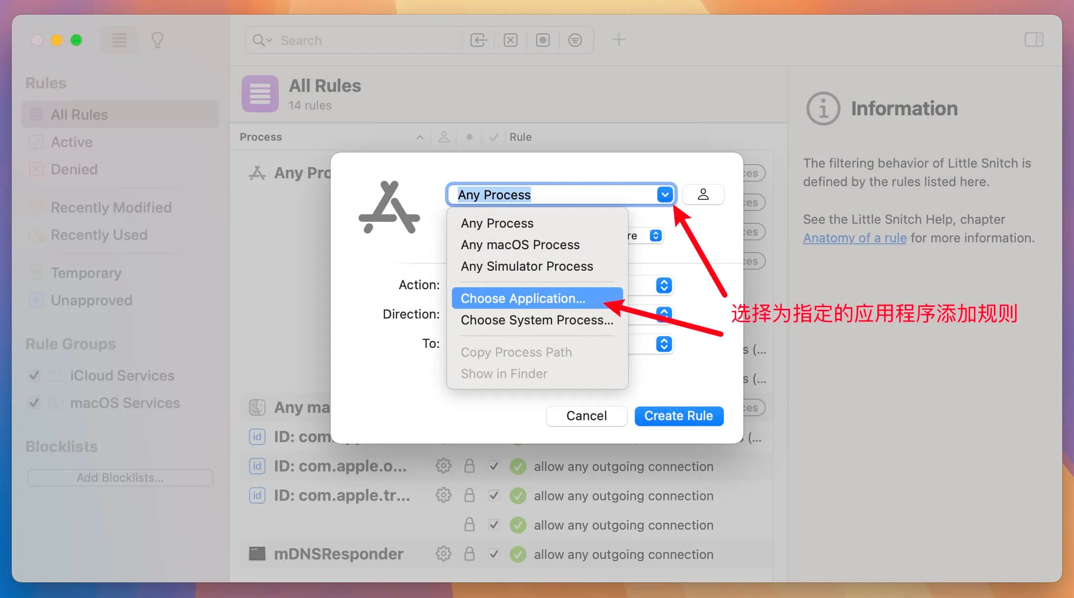 第九步、选择 Choose Application 指定一个应用程序,即单独为某一款应用设置规则(同时将Little Snitch 6软件自身屏蔽防止激活失效)
