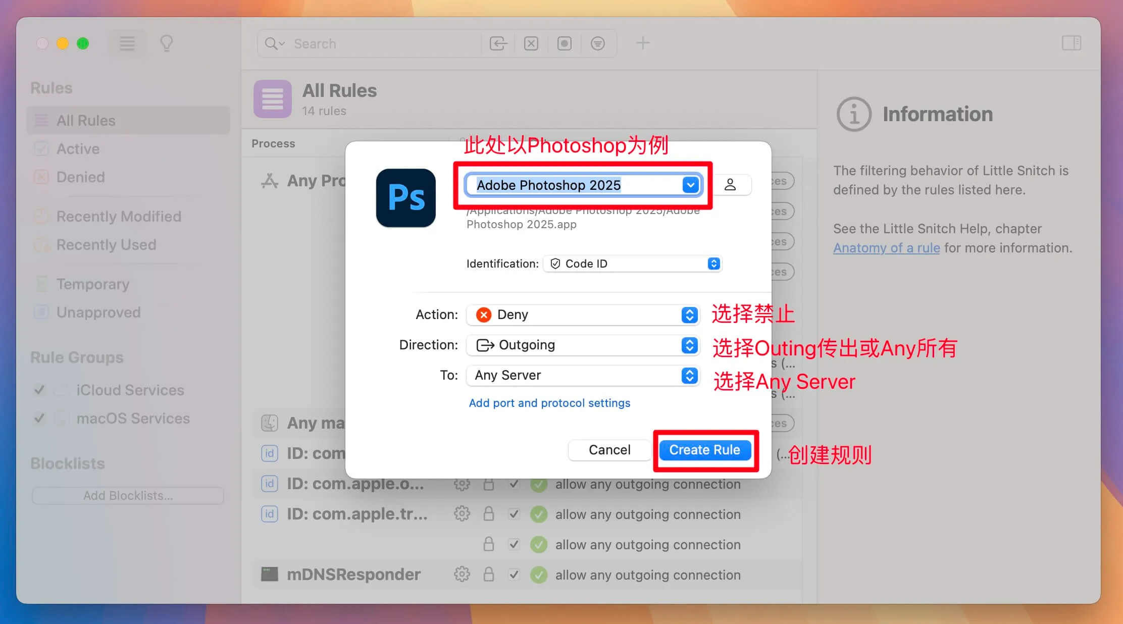 以上设置解释:Photoshop禁止所有服务传出/任意方向的网络连接。