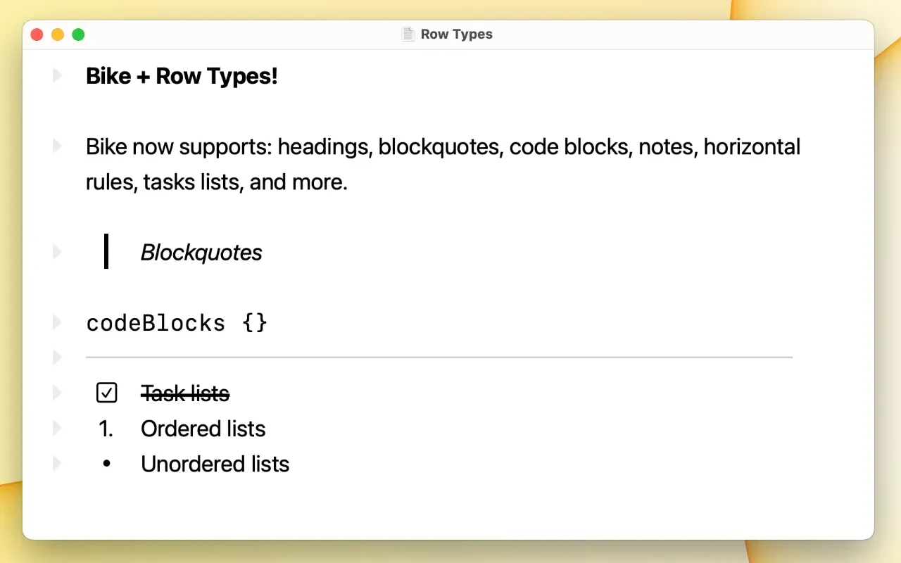 Bike 为原生 Mac 应用,代码轻量、资源占用极低,启动速度快、响应灵敏,即使在数千行笔记文档中滚动与编辑也毫无延迟。 -