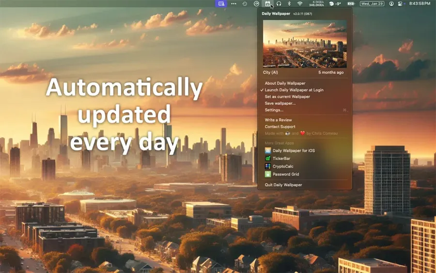 - 自动每日壁纸: 每天在您的Mac桌面上设置一张新的美丽壁纸。Daily Wallpaper会自动下载并应用新背景,无需您任何操作。