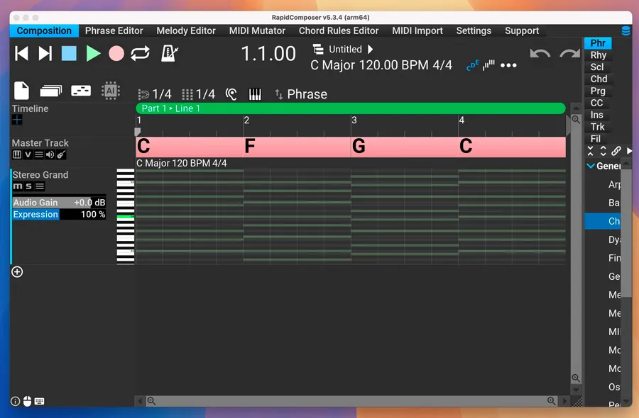 软件提供了强大的和弦生成器和旋律生成器,用户可以根据需要快速生成和弦进程、旋律和音乐片段。 - 片段式作曲