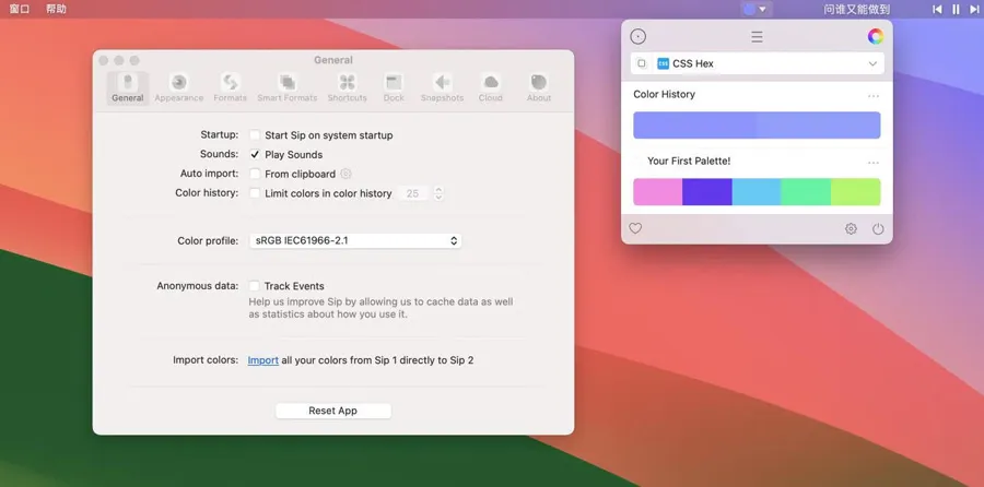 在 Mac 上使用 Sip,你会发现它的取色功能 极其便捷,只需点击菜单栏图标,即可使用快捷键快速取色,并支持 颜色自动复制。相比 系统自带的取色工具,Sip 提供 更专业的色彩管理能力,支持 RGB、HEX、CMYK、HSB 等多种格式转换,并能创建 调色板 方便后续使用。尤其是 多显示器支持、团队共享色彩方案、颜色历史记录 等功能,使其成为 设计师必备工具之一。