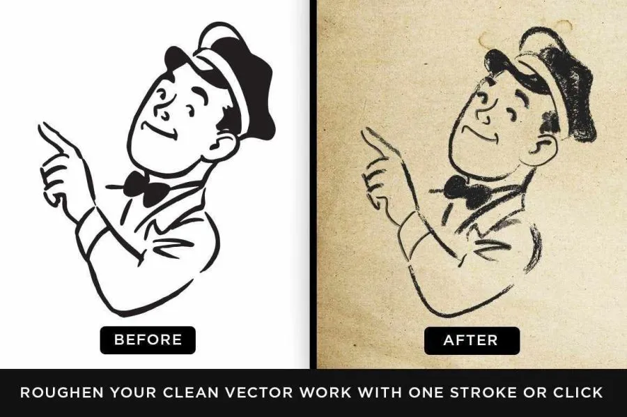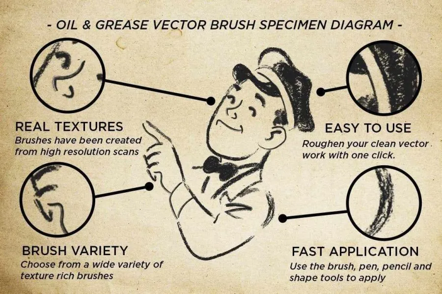 我们找到了真正的 60 年历史的蜡油蜡笔,并将它们转换成 Illustrator 的艺术画笔。从上面的示例图像中可以看到,纹理完美呈现了蜡油蜡笔的外观。我们还努力在逼真的画笔和锚点之间取得良好的平衡,这样它们就不会减慢 Illustrator 的速度。