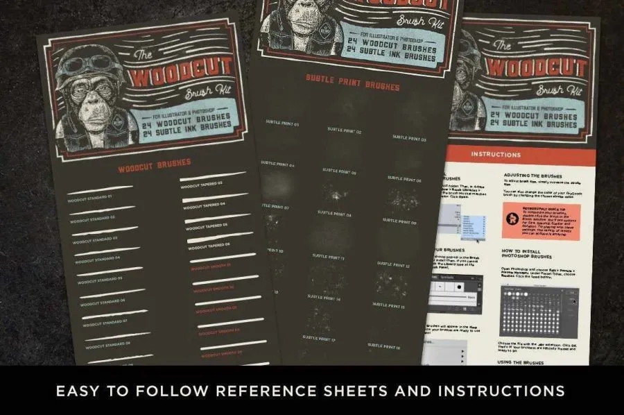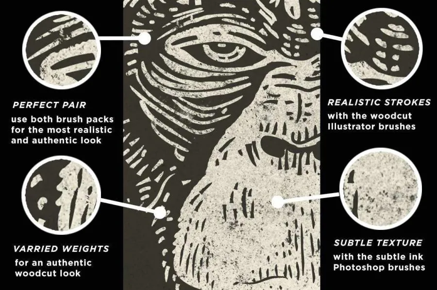 借助这个包含 32 个用于 Adobe Illustrator 的木刻画笔和 24 个用于在 Photoshop 中添加画龙点睛的墨水纹理画笔的集合,为您的插图提供逼真的木刻、版画和 浮雕 效果。