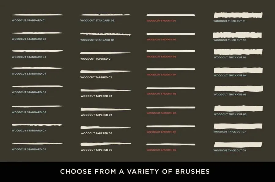 - 32 种适用于 Adobe Illustrator 的木刻画笔,有多种长度和粗细可供选择。
