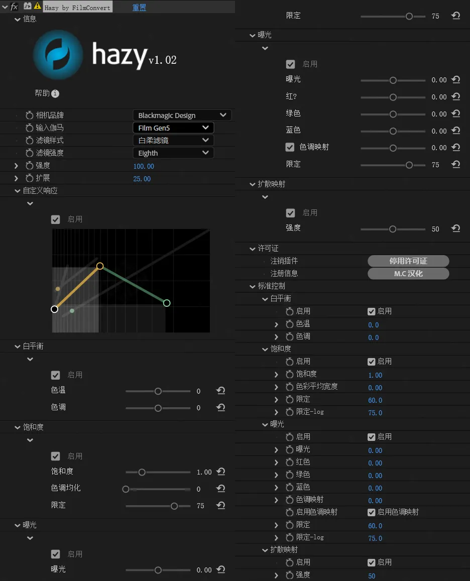 - 可定制的控件:使用 Hazy 的自定义响应控件将您的评分提升到一个新的水平,这些控件决定了效果的衰减。自定义响应图会根据您选择的滤镜样式进行更改,每个点都会适应扩散滤镜的形状。这允许您确定效果最突出的位置,从而获得您想要的外观。