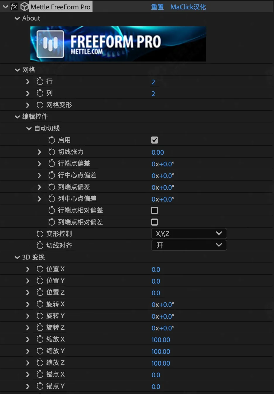 FreeForm Pro 适用于 After Effects 的专业级 3D 网格变形插件,功能和效果非常强大,能模拟制作出一些意想不到的效果。FreeForm Pro是在 After Effects 中进行复杂图层变形的简单方法。三个主要功能:网格变形、位移贴图和渲染基元。还可以将ae的图层做各种扭曲变形的效果,比如地形、运动图形效果、图形阵列、水流模拟、角色动画、形状变形等等!也适合角色动画。FreeForm Pro 还可以与GEOlayers一起使用 ,根据真实数据创建 3D 地形。