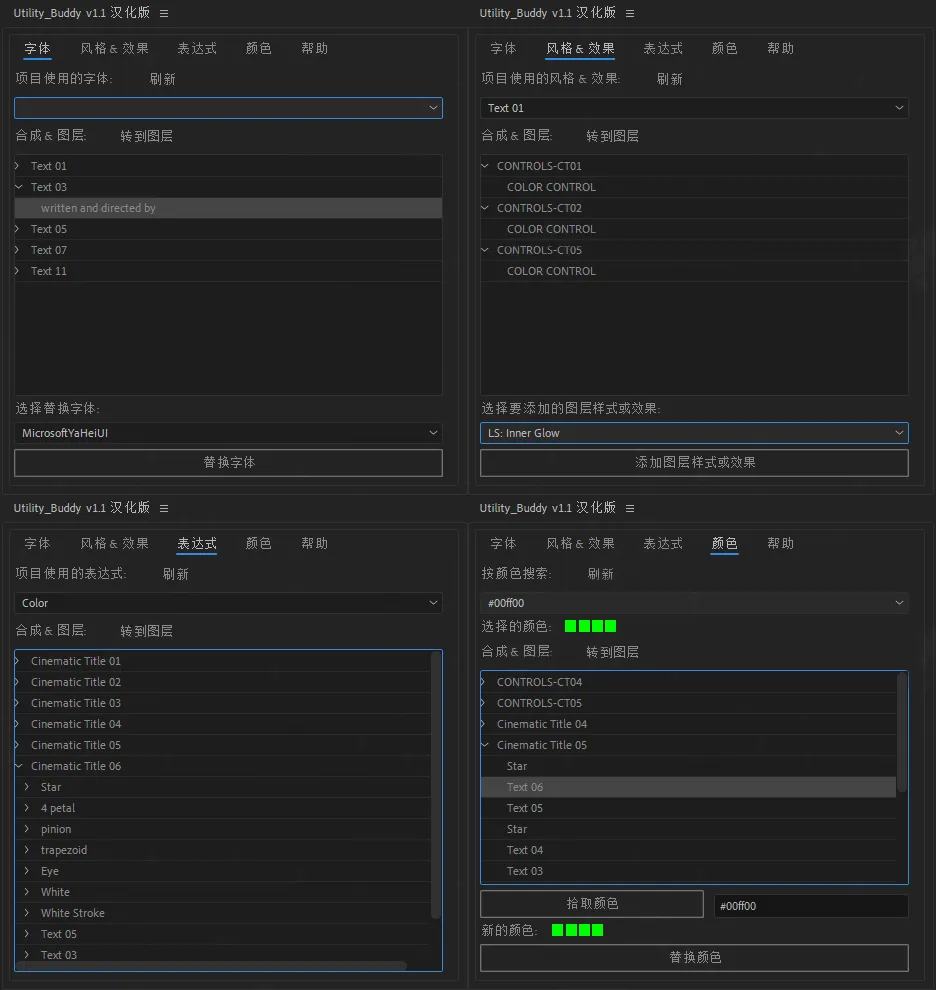 Utility Buddy 是一个有用的工具,可以帮助您查找和更新项目中的字体、表达式和效果。新功能:颜色搜索!只需展开任意选项卡,单击刷新按钮即可快速查找项目中所使用的字体、表达式、颜色和效果并定位到该合成和图层位置,您可以根据需要一键替换修改。