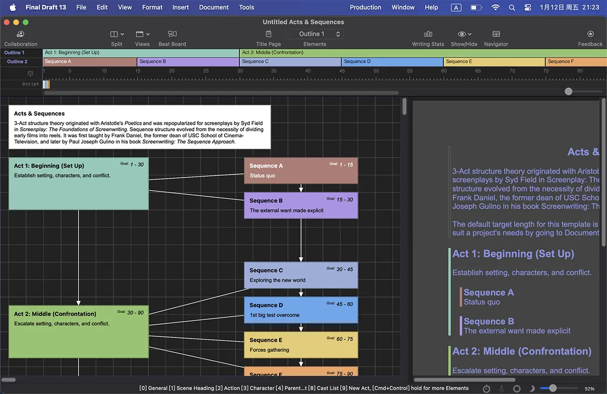 自动剧本格式化:Final Draft 13 自动应用行业标准的剧本格式,包括角色、场景标题、对白、动作等元素,用户只需专注内容创作。