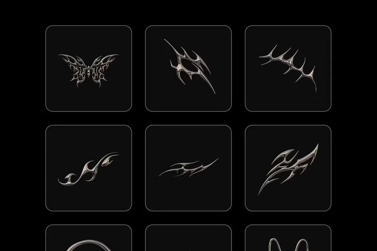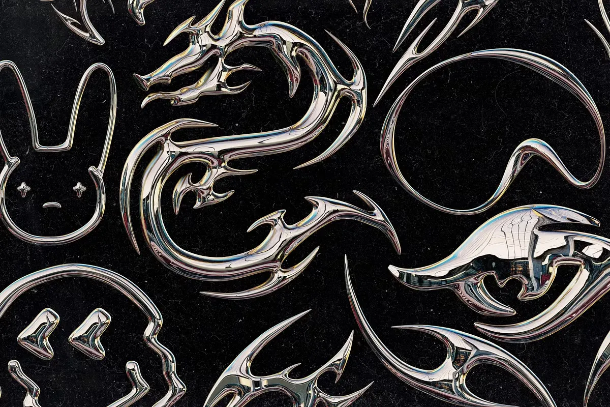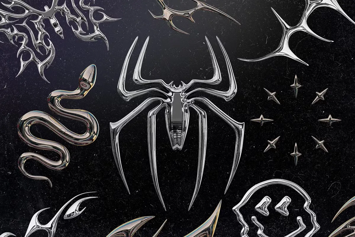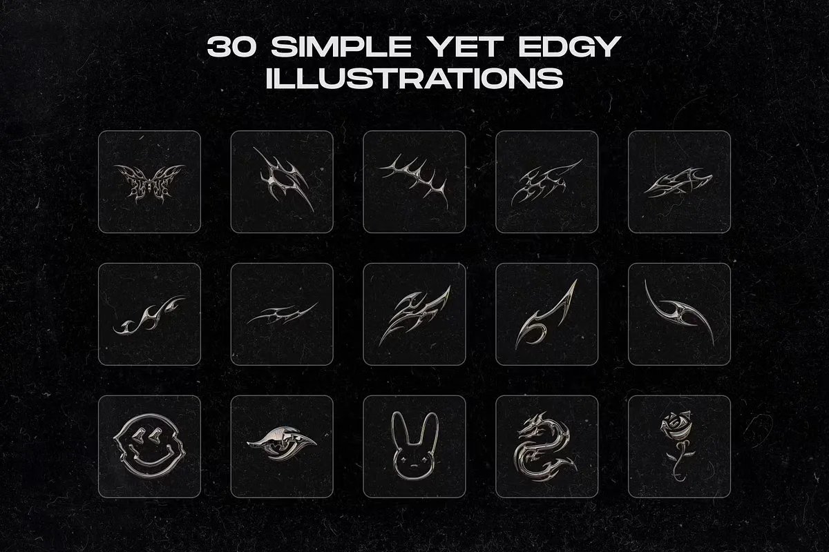 30 Grunge 插图集采用时尚镀铬效果的图片,在表面产生金属饰面(镜面反射)。这是一个简单而富有戏剧性的效果,让这些平面图形栩栩如生,让您充满 80 年代/90 年代的电影怀旧情怀。我们清晰的 3D 插图以简单的形式创建,没有多余的东西。自然,所有插图都与 Blender、Figma 兼容,并采用 PNG 格式(3000*3000像素)。