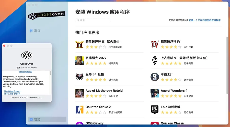 使用 CrossOver on Mac,你会感受到它为 Windows 程序打造的无缝适配体验。安装和运行 Windows 软件的过程相对简单,界面友好,能够自动检测并配置所需的运行环境。软件启动速度快,运行过程中稳定流畅,兼容了包括办公软件、设计工具、游戏等多种应用类型。在 Apple Silicon 机型上,CrossOver 通过内置的技术支持 Windows x86 程序的高效执行,确保用户使用体验不打折扣。整体使用中,减少了在虚拟机和双系统间切换的繁琐,让 Windows 应用在 Mac 上的使用更加便捷。