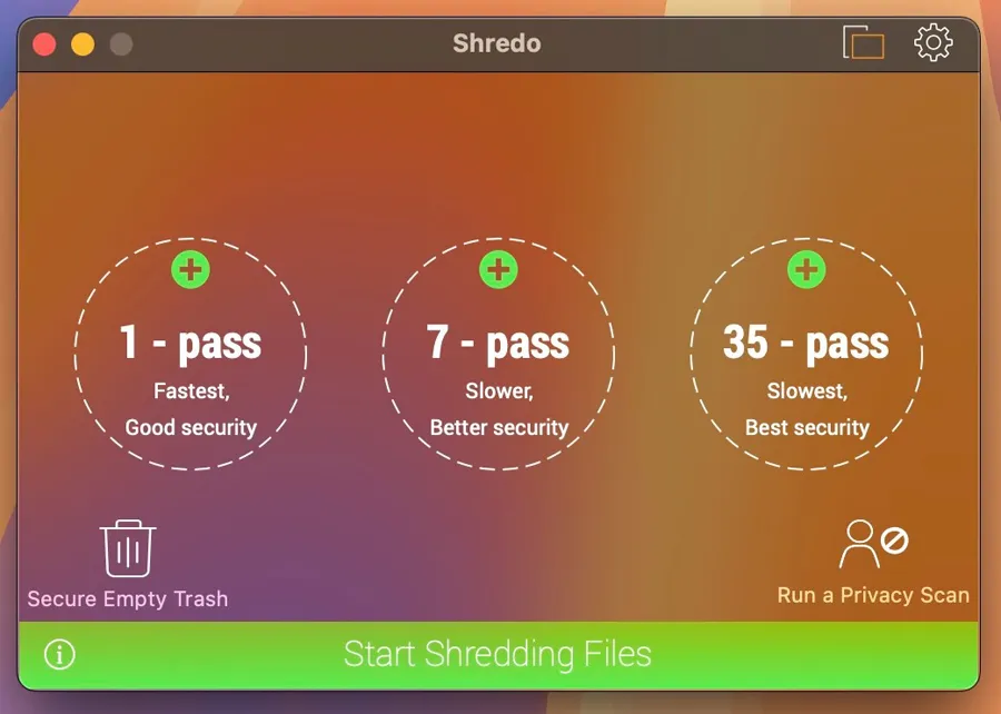 在 Mac 上使用 Shredo,操作非常简洁,只需将文件或文件夹拖拽到应用窗口中即可完成粉碎。软件界面直观清爽,没有繁琐的设置,删除速度快,同时支持多种粉碎方式,让用户根据需求选择合适的安全等级。
