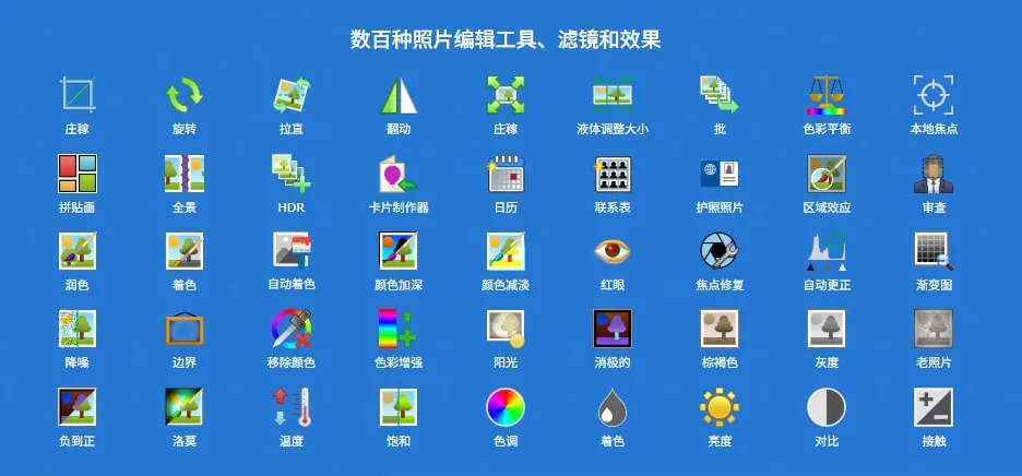 - 应用照片效果,包括油画、卡通、晕影、棕褐色等等