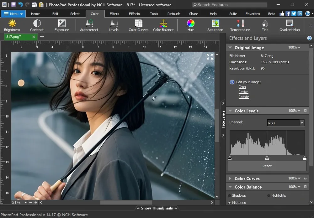 - 调整色彩平衡、曝光、色阶、亮度、对比度等