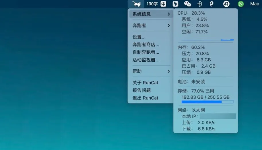 RunCat 可以显示系统的Cpu、磁盘、网络的基本信息,让你对你的mac了如指掌。