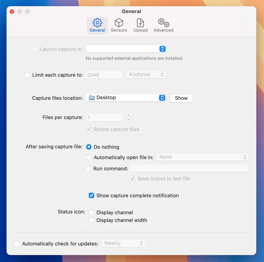 在 macOS 上使用 Airtool 非常直观,启动软件后用户只需选择要监听的无线信道,即可一键启动抓包。软件界面清爽无冗余,设置逻辑清晰,即使是初次使用者也能快速上手。抓取数据可实时保存为标准格式,并支持指定抓包持续时间、通道跳转与文件分段。Apple Silicon 优化让整机在抓包过程中保持低资源占用,系统运行依然流畅,适合长时间后台监听或协助远程调试使用。配合 Wireshark 使用效果尤为突出,构建了完整的无线抓包与分析链路。