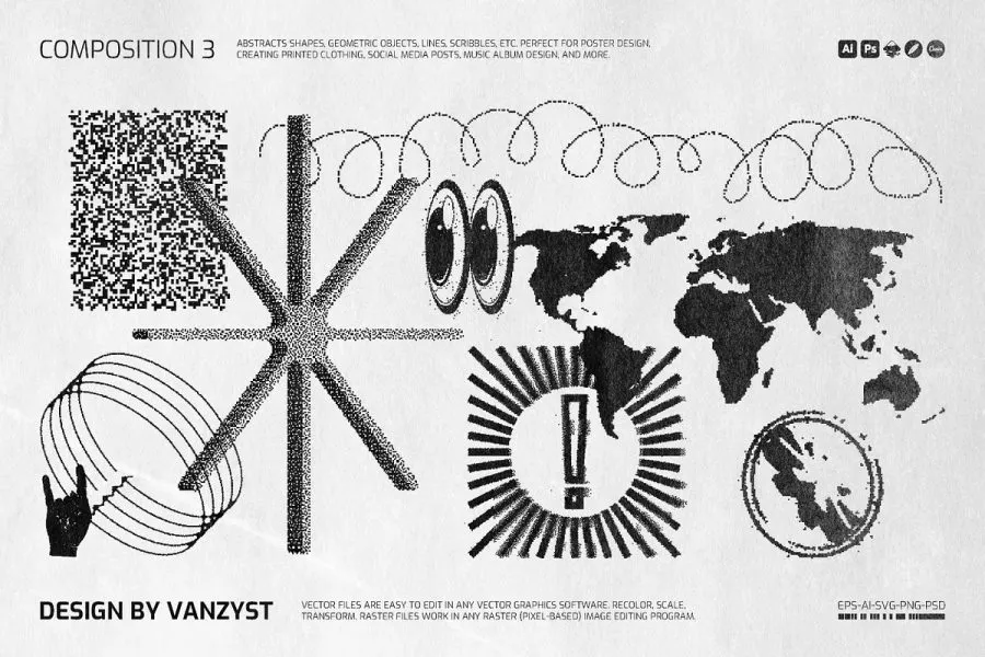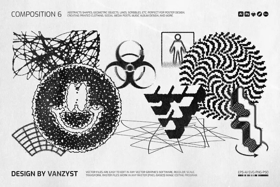 “138 Bitmap Vector Shapes Pack”中的设计元素非常适合时尚海报设计、创建印花服装、街头时尚品牌、标志设计、社交媒体帖子、音乐专辑设计、贴纸包、包装设计等。这些非凡的图形资源可以补充您大胆的现代设计项目并节省时间。