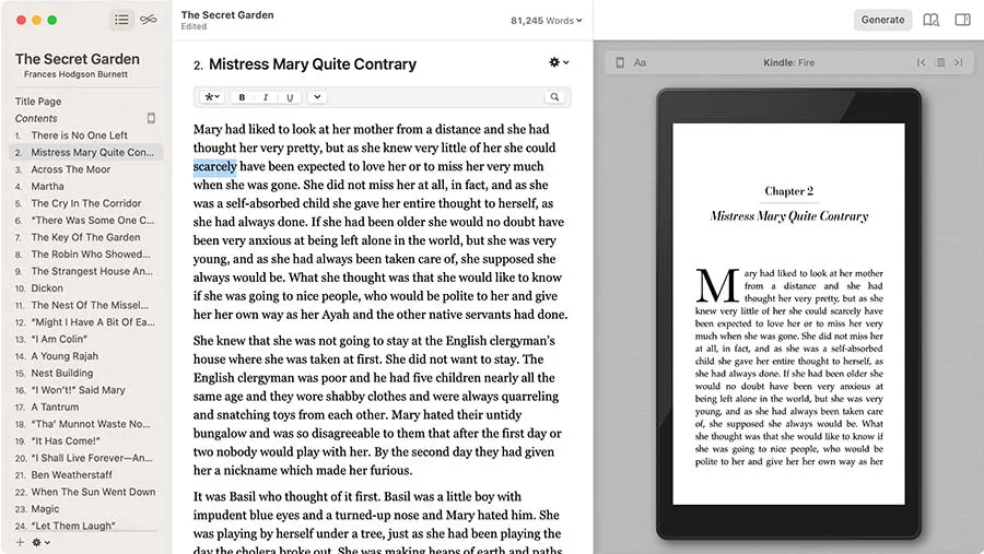 - 设备适配预览:提供 Kindle、iPad、iPhone 等设备模拟视图,确保电子书在多平台上呈现一致。
