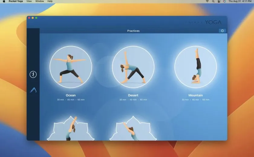 在 Mac 上使用 Pocket Yoga 的体验极为流畅自然,应用界面清爽简洁,课程导航清晰明了,用户只需点击几下即可开始锻炼。系统会同步显示动作名称、语音提示、呼吸节奏以及当前所处的时间进度,非常适合静态练习时全程跟随。尤其在大屏幕 MacBook 或连接外接显示器时,整个练习氛围更加沉浸。软件支持中文界面和文字提示,帮助用户精准掌握动作,对习惯在家练习的人群尤其友好。