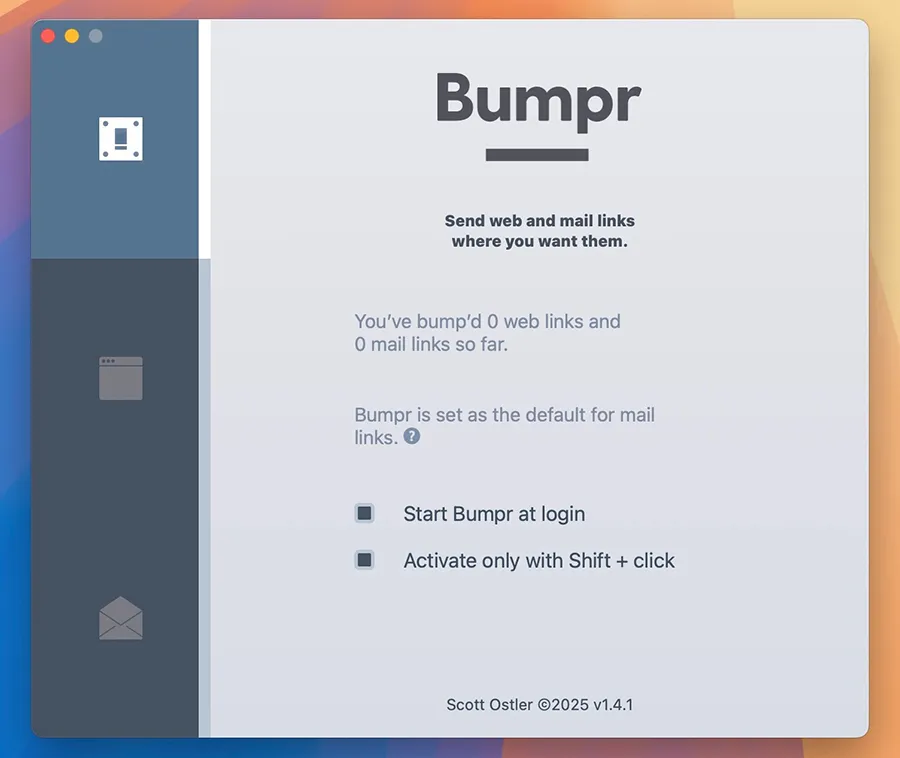 Bumpr for Mac 是一款小而美的效率工具,完美解决了Mac用户在多浏览器和多邮件客户端之间来回切换的困扰。它让用户能够在每一次点击时自由选择,从而兼顾灵活性与效率。对于开发者、设计师,或需要区分工作与个人应用场景的人来说,Bumpr都是极具价值的选择。如果你也想体验这份简洁与高效,可以前往“像素里”搜索Bumpr,进入详情页下载。平台安全可靠,版本均经真机实测,让你放心使用,轻松提升工作流。