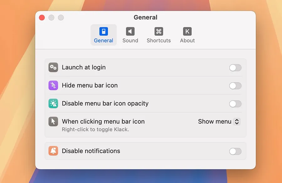 Klack 支持在应用程序菜单栏进行控制,用户可以快速启用或禁用音效功能,方便在不同工作场景中进行灵活调整。 - 高效的本机应用性能