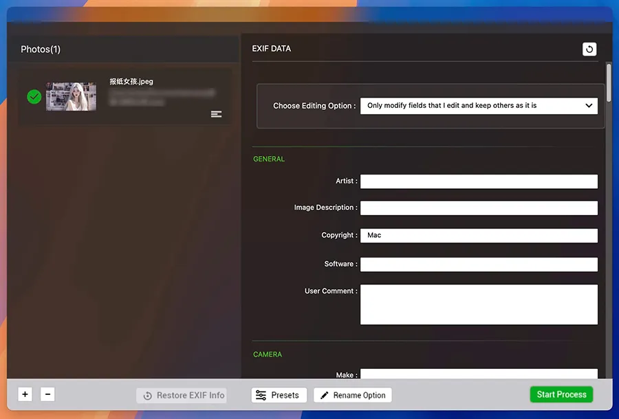 Photos Exif Editor 的界面简洁直观,支持拖拽批量导入照片,操作流程清晰;用户可快速查看和编辑拍摄时间、地理位置、相机型号等信息。Mac 版本在 macOS 上运行稳定,响应迅速,充分利用系统资源处理大量照片,高效且顺畅。软件支持批量处理和自动备份功能,提升了使用便捷性和数据安全性。