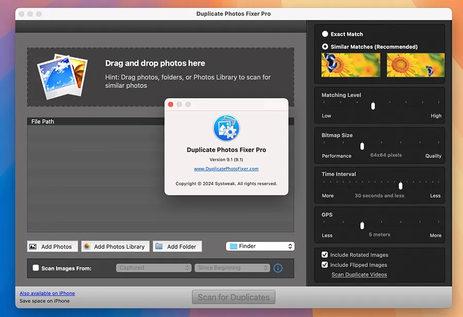 Duplicate Photos Fixer Pro(中文常称“重复照片清理专家”或简称“重复照清理 Pro”)是一款专为 macOS 用户设计的照片去重及相似图像整理工具。由 Systweak Software 开发,其核心定位是帮助用户快速发现并删除硬盘、照片库、外部存储或云端中重复或相似的照片,释放存储空间、保持照片库整洁。它兼容 macOS 多个版本,并支持多种图片格式,包括 JPEG、RAW 等,能对真实的重复,以及经旋转、翻转或轻微编辑后的类似图片进行检测。