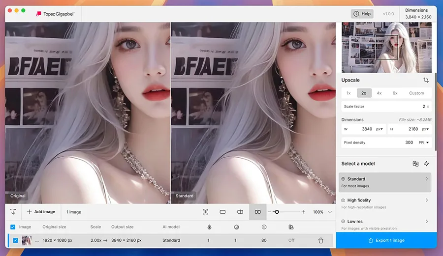 使用 Topaz Gigapixel 放大图像的过程非常直观:将低分辨率图片拖入应用,选择放大比例,软件即可在几分钟内生成高分辨率输出。处理后的图像清晰度高,细节恢复自然,即使是旧照片或网络图像也能呈现出理想效果。界面简洁,操作易懂,批量处理功能也极大提升了工作效率。
