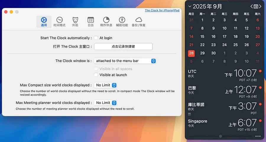 The Clock(中文常称“世界时钟助手”或简称“The Clock”)是一款专为 macOS 打造的时间管理与时区查看工具。它不仅能显示多个国家和城市的时间,还能整合日历、提醒事项和倒计时功能,帮助用户在跨时区工作、开会或旅行时轻松掌握全球时间动态。Mac 版在界面设计上高度贴合系统风格,支持深色模式、Retina 显示和菜单栏快捷操作,特别适合需要频繁跨时区沟通的职场人士、自由职业者和跨境团队。