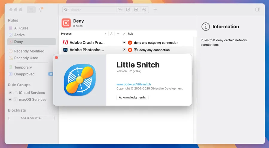 Little Snitch 通过全面监控所有网络活动,帮助用户阻止那些未经授权的网络连接,避免恶意软件和不信任程序从系统中发起数据传输。 - 简洁的界面与用户友好体验