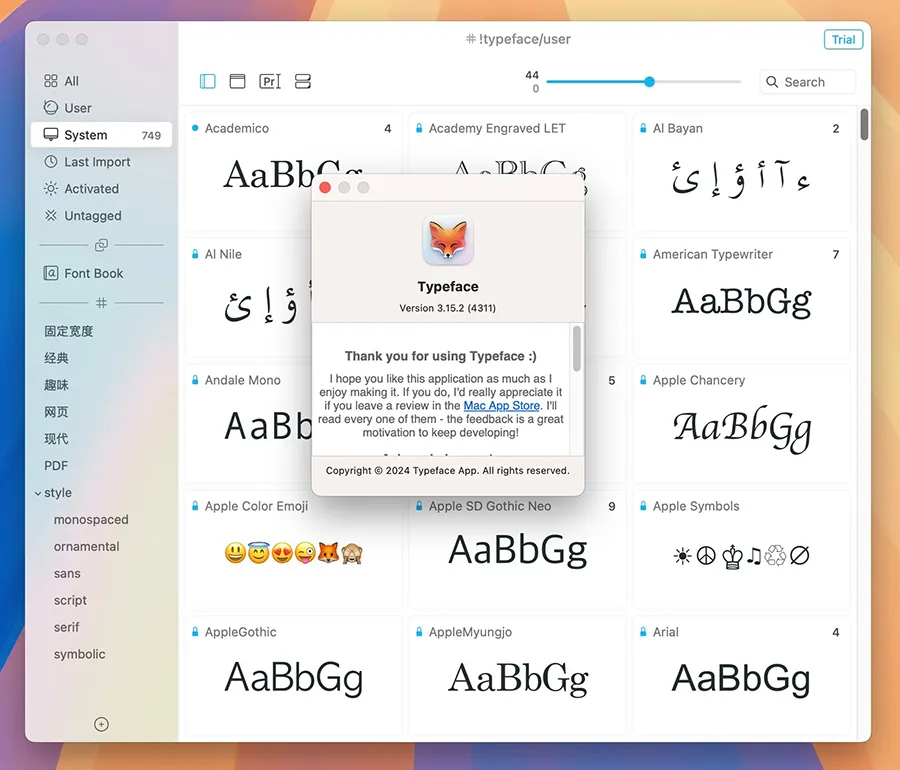 Typeface 完美兼容 macOS,能够与系统自带的字体工具协同工作,确保用户能够无缝切换和管理字体。