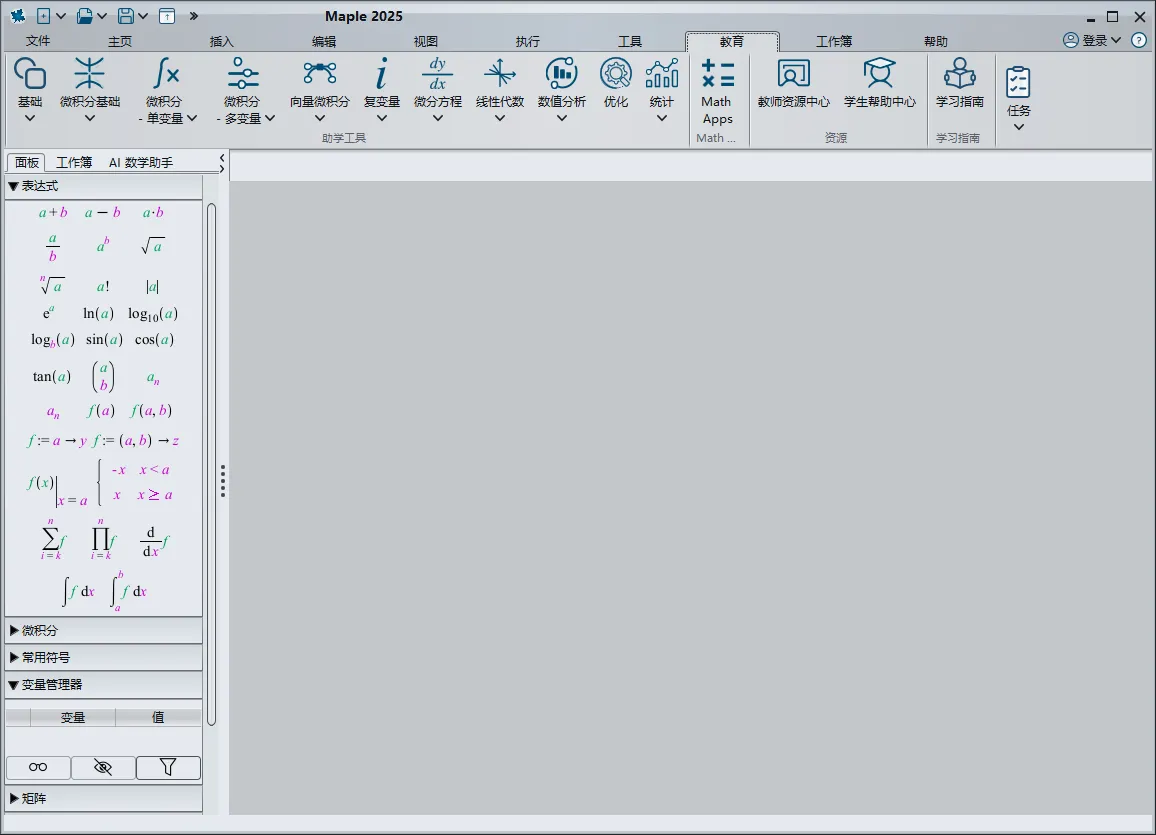 Maple 2025(通常简称 “Maple”)是由 Maplesoft 公司推出的一款高级数学计算与符号运算环境。在国内,很多用户称其为“Maple 数学软件”或“Maple 系列工具”。它集成符号运算、数值分析、可视化与交互文档功能于一体,适用于科研人员、工程师、数学教师与学生等群体。凭借更多数学功能、全新界面、增强的教育与连接工具,以及诸多改进,这个用于探索、可视化和解决最棘手数学难题的最强大、最全面的环境,比以往任何时候都更出色!