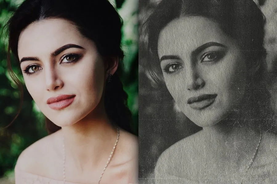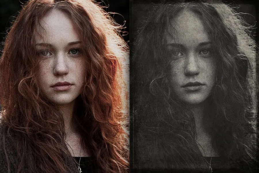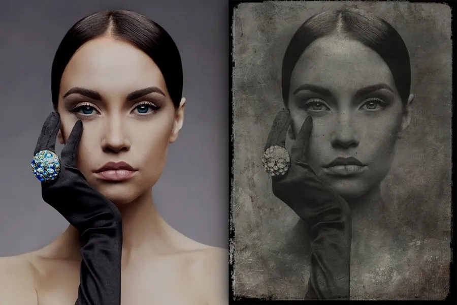 只需想象一下,只需单击两次即可将任何照片转换为旧专辑的复古风格。您还可以使用制作此效果的PS动作,您将获得经过微调的色彩校正,它肯定带有旧的黑白照片的阴影和两组纹理,以模拟照片表面的复古纸和划痕。