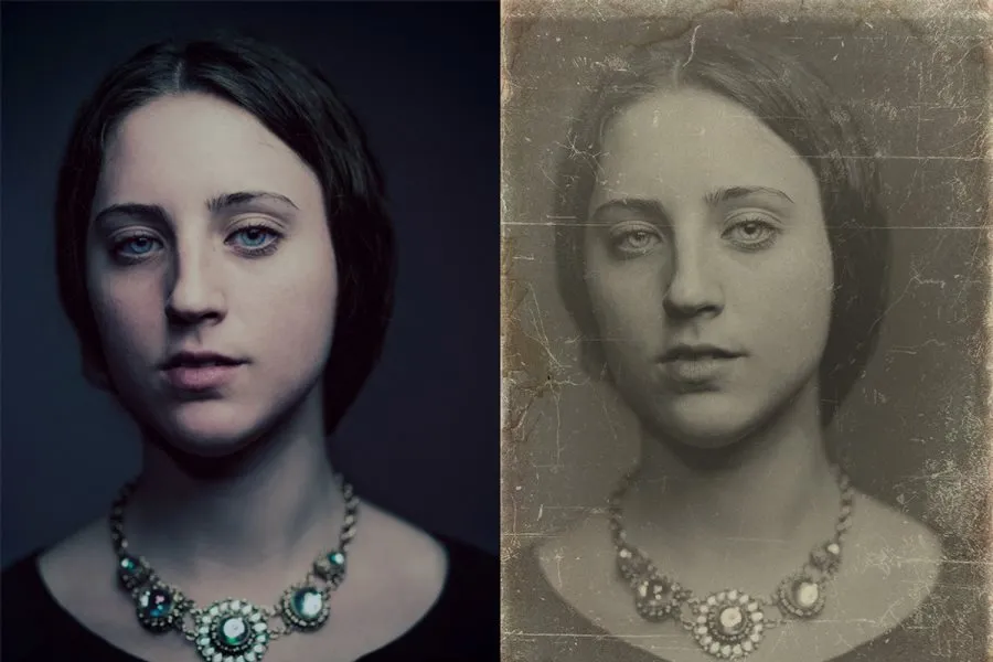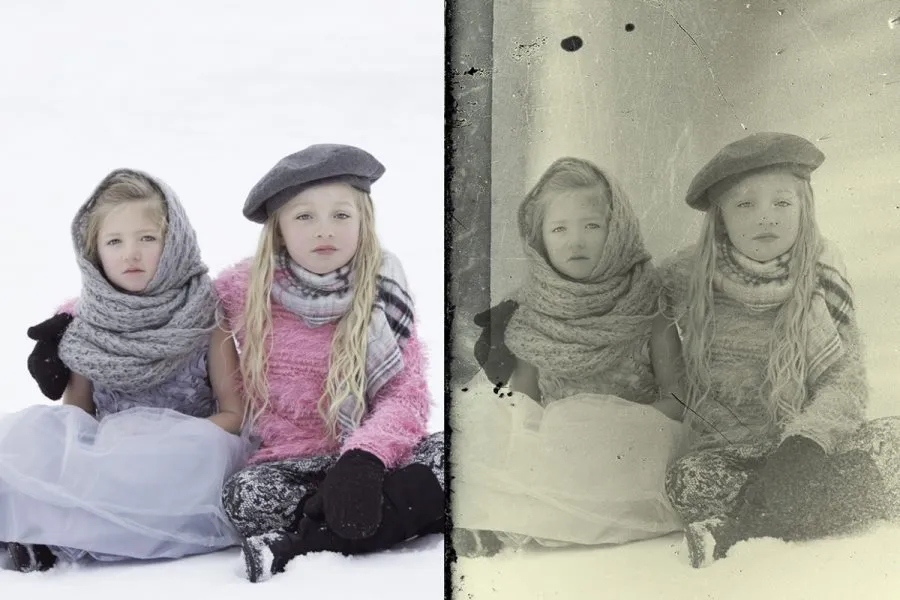 只需想象一下,只需单击两次即可将任何照片转换为旧专辑的复古风格。您还可以使用制作此效果的PS动作,您将获得经过微调的色彩校正,它肯定带有旧的黑白照片的阴影和两组纹理,以模拟照片表面的复古纸和划痕。