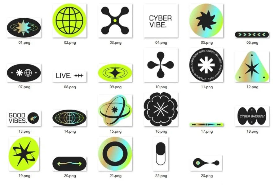 23 张 Y2K 全息徽章贴纸适用于包装设计、拼贴艺术、剪贴簿、贴纸、海报、明信片和所有创意设计。由于矢量形状和组织良好的图层,所有徽章都易于编辑、自定义和调整大小。