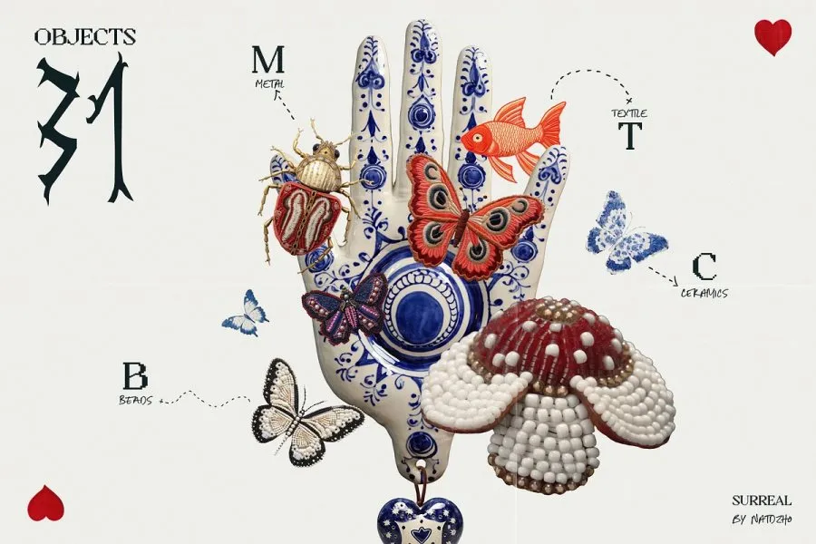 这款不拘一格的数字拼贴套件将手工艺术和超现实主义神秘地融合在一起。与之相伴的是纺织品、陶瓷、珠子和金属等各种介质上的手工纹理,每一种纹理都承载着工匠的触感。该套件包括一系列超现实面具和串珠昆虫,以及复古邮票和宝丽来照片,所有这些都旨在为您的创作注入神秘感和自我发现感。超过 100 件独立作品,为您开启神秘神秘的艺术之旅。