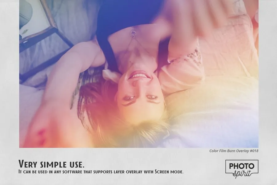 适合业余爱好者和专业人士。彩色和黑白照片上的效果极佳。为了方便起见,添加了在屏幕模式下选择和叠加叠加层的操作。这在 Photoshop 和 Photoshop Elements 中均有效。彩色胶片刻录叠加层可用于任何支持屏幕模式下的图层叠加的图形编辑器。