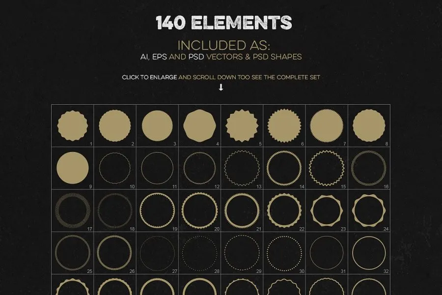 无论您是 Illustrator 还是 Photoshop 用户,都可以创建数以千计的令人惊叹的高品质徽标。所有元素、徽标和纹理都包含在 AI、PSD 和 EPS 完全可编辑文件中。但等等,还有更多!如果您是 Photoshop 用户,我们会为您提供更轻松的服务!元素也包含在 Photoshop Shapes CSH 文件中,纹理包含在 Photoshop Brushes ABR 文件中。