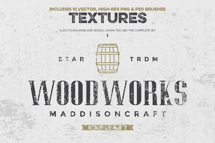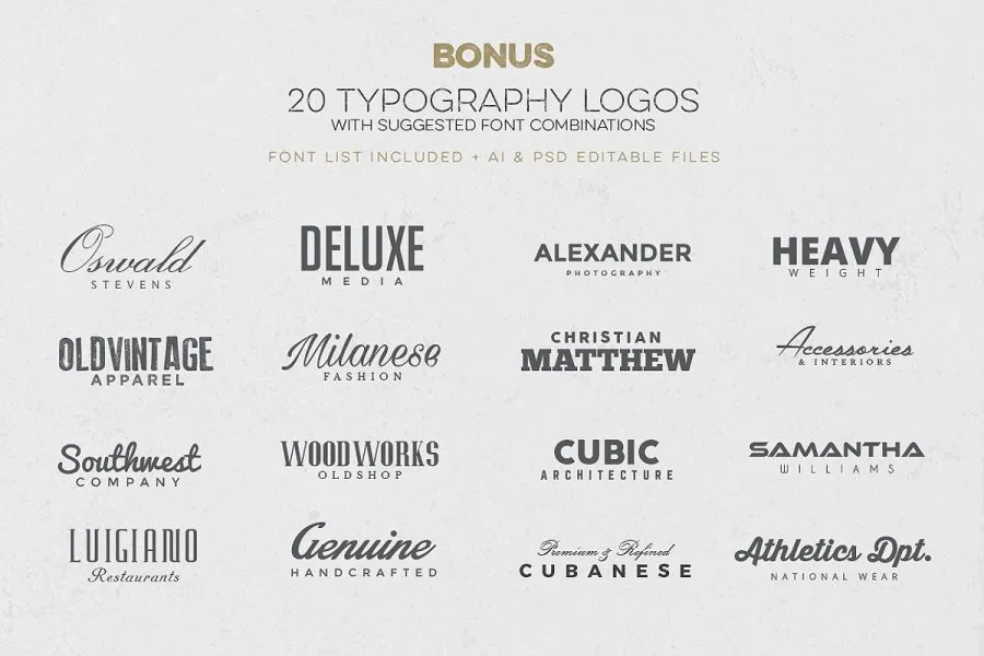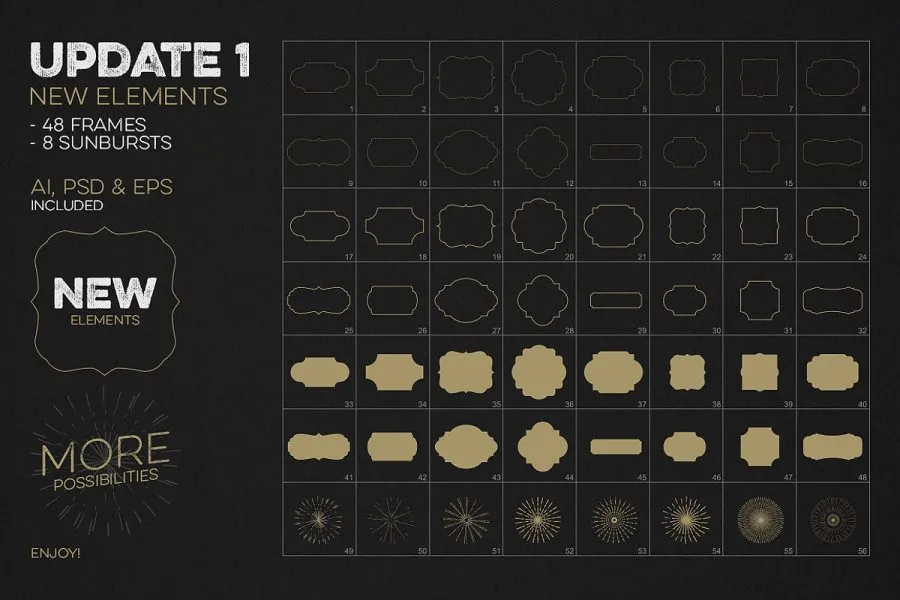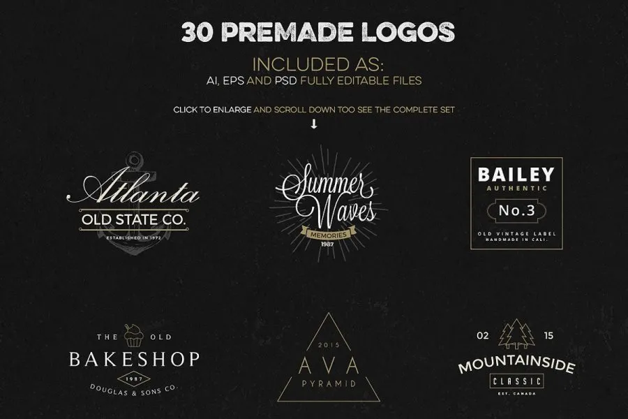 此包中包含 300 个元素、10 种纹理和 40 多种建议字体 + 30 个预制徽标和 20 个排版徽标。想象一下各种可能性!