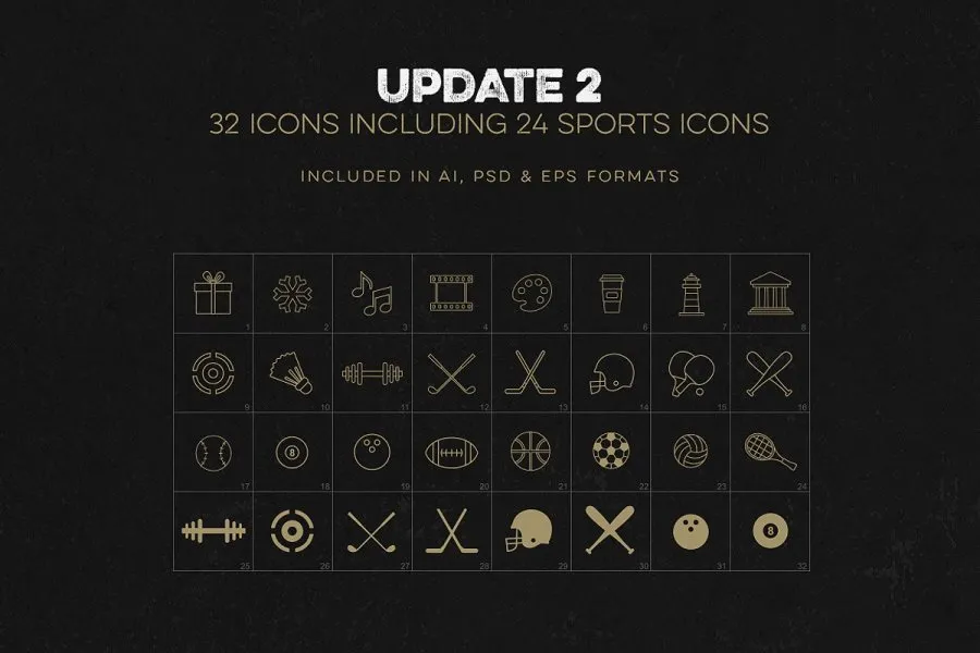 Update 2 功能:32 个新图标,包括 24 个体育图标