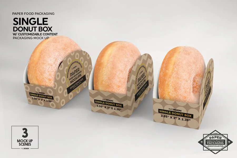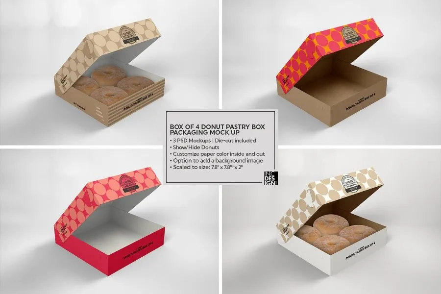第 11 卷:纸质食品盒包装样机系列 – 甜甜圈/糕点盒 v11.1,包含了十 (10) 个分层 PSD 模型;3 种不同风格的盒子。这些都是高质量/分辨率文件 | 5400×3600 | 18”x12” | 300dpi;您只需选择添加您自己的背景图像,轻松更改背景颜色。包含盒式折叠模板,按比例缩放(折叠形状尺寸如下所示)。这些是空白的 psd 模板,可用于展示您的设计。预览图像上的设计仅供参考,不包含在内。这些模板最适合使用 Photoshop CC 2015 及更高版本